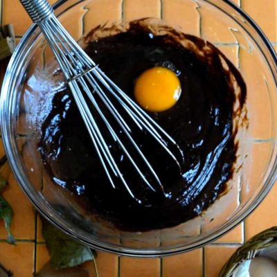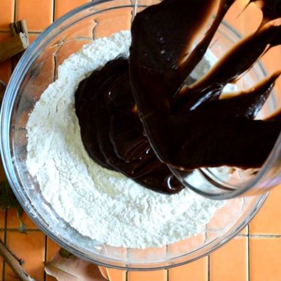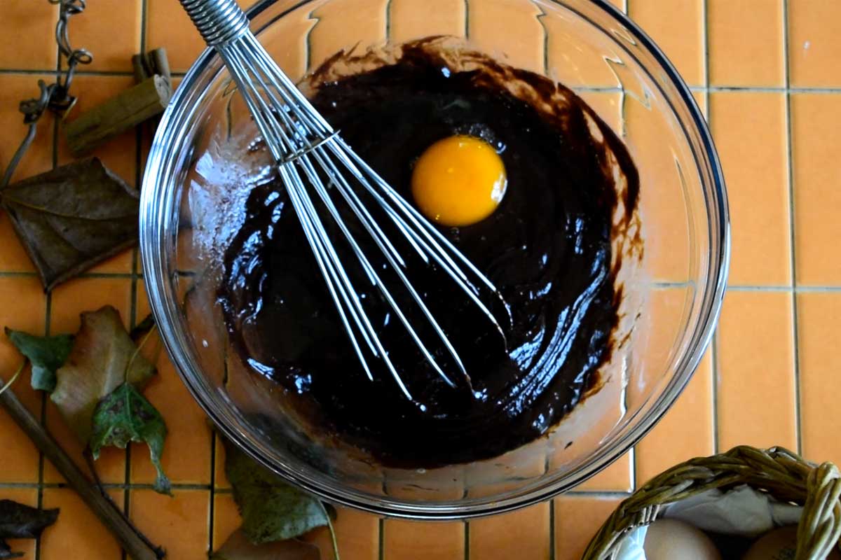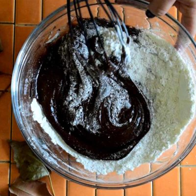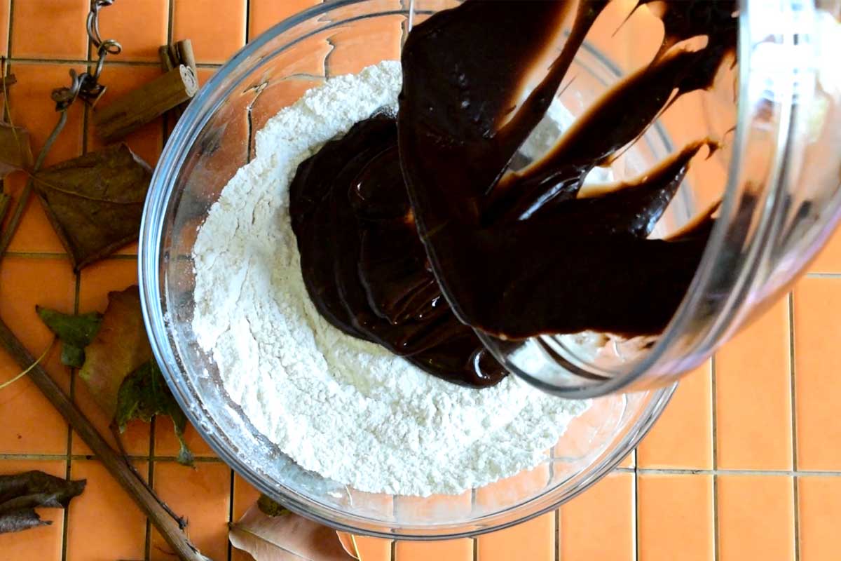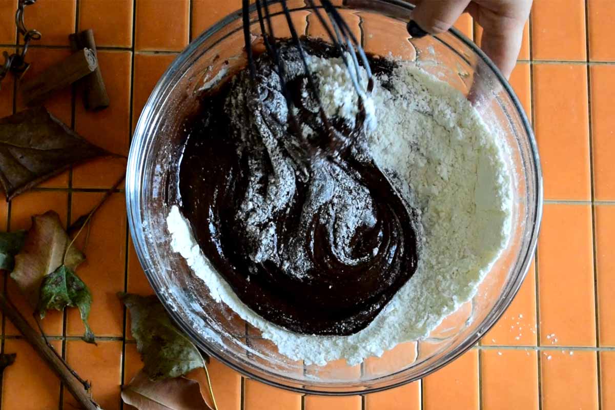 Aggiungere poi le polveri poco per volta al composto di cioccolato e uova. Mescolare fino a quando tutto è combinato.