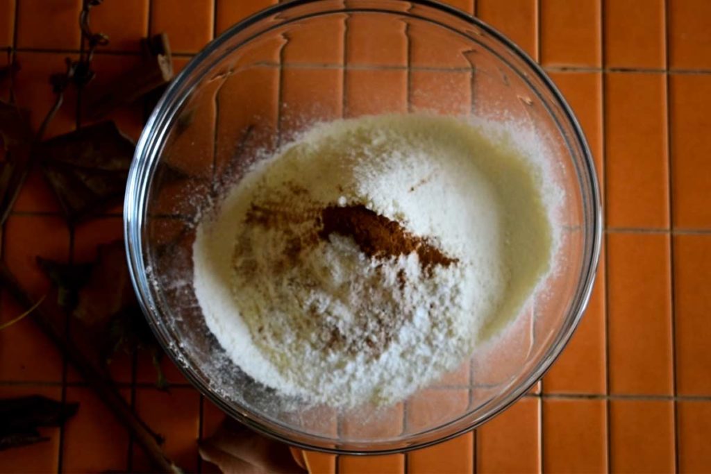 In una seconda ciotola, mescolare insieme la farina, lo zucchero, il lievito, il sale e la cannella.