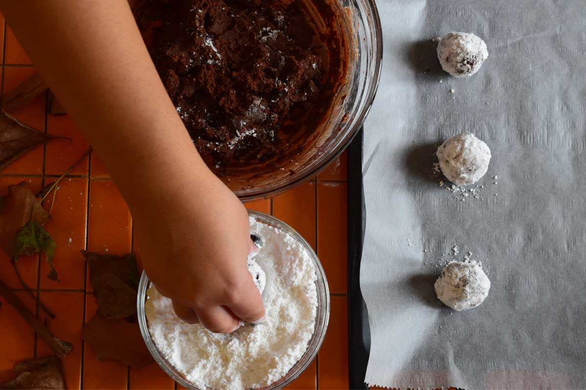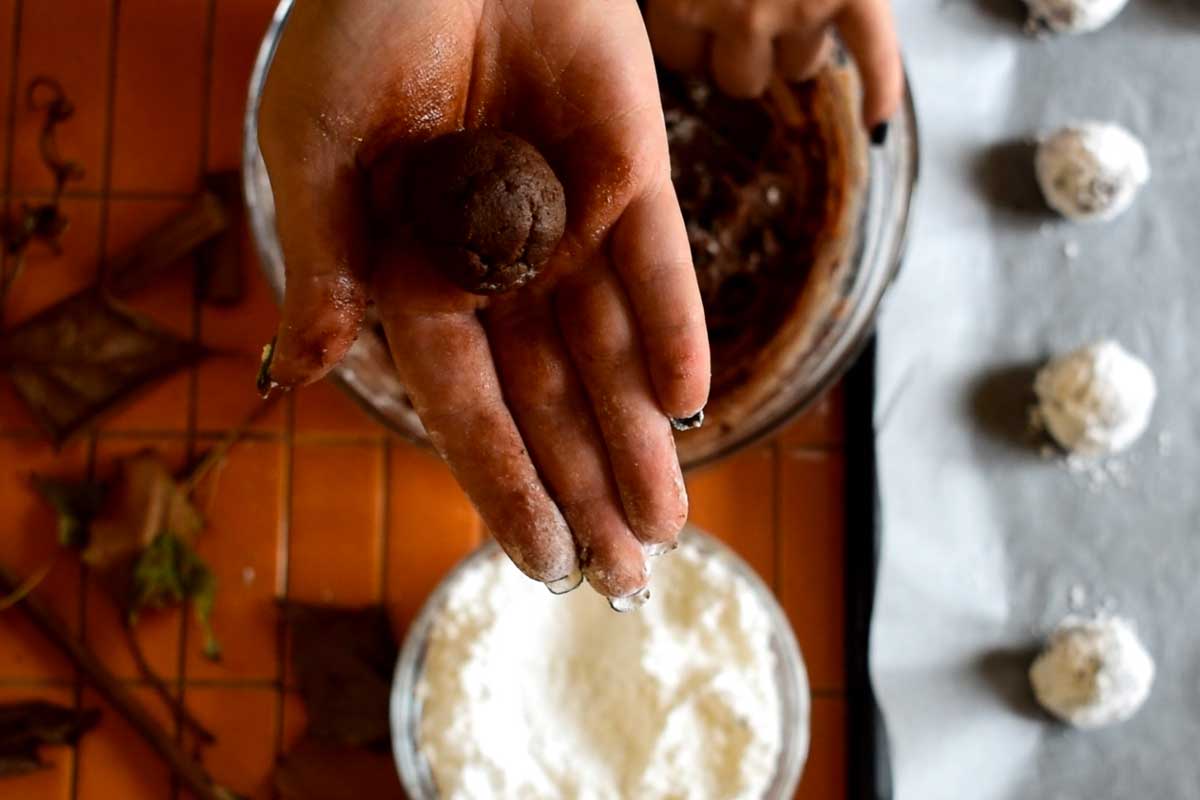 Far rotolare le palline nello zucchero a velo in modo che siano ben coperte.