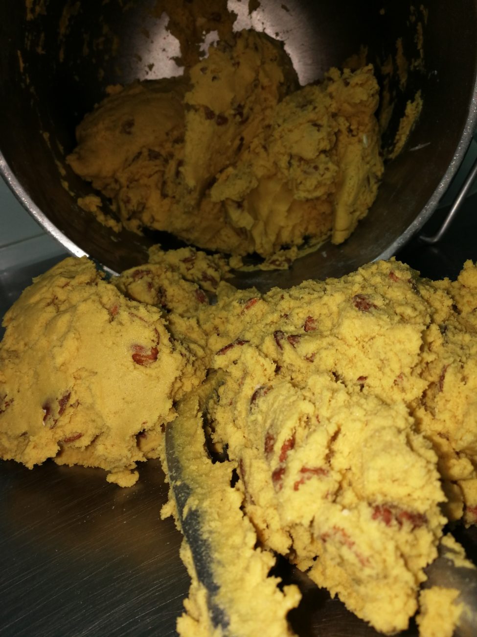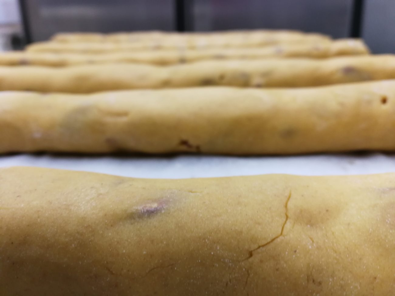 ImpastoMontare le uova e lo zucchero nella planetaria, aggiungere la vaniglia e poi mettere il lievito e la farina facendo attenzione a non metterla tutta perché bisogna lasciarne un po' per la formatura. Appena la farina viene assorbita, mettere le mandorle facendo girare ad una velocità ridotta per non rompere tutte le mandorle. |