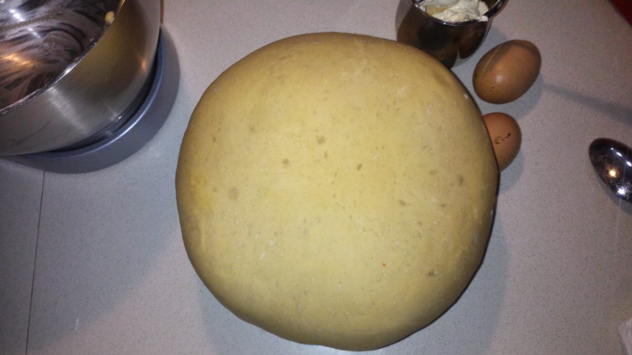 Impastare il lievito con la farina, il latte, lo zucchero e le uova. Quando l'impasto è ben omogeneo aggiungere il burro e impastare ancora fino ad avere un impasto liscio. In alternativa si potrebbe fare le pieghe per sfogliare, ma con il burro chiarificato l'impasto risulta molto morbido e difficile da sfogliare. Far lievitare in un luogo caldo affinchè il volume sia triplicato. Di solito 8/12 ore a seconda della temperatura ambientale.