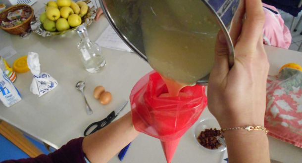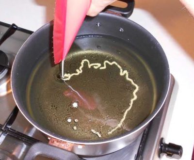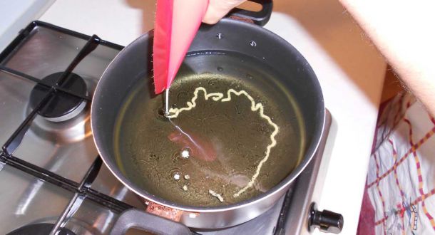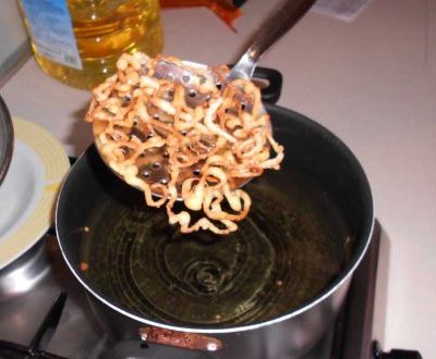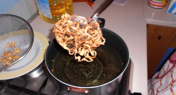 Mettere l'olio a scaldare, inserire il composto in una sac a poche e tagliare la punta della sacca poco poco. Far colare il composto nell'olio bollente formando delle spirali. Cuocere per un paio di minuti per lato, facendo attenzione quando girate.