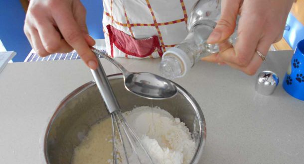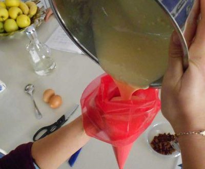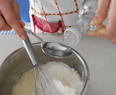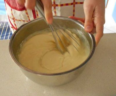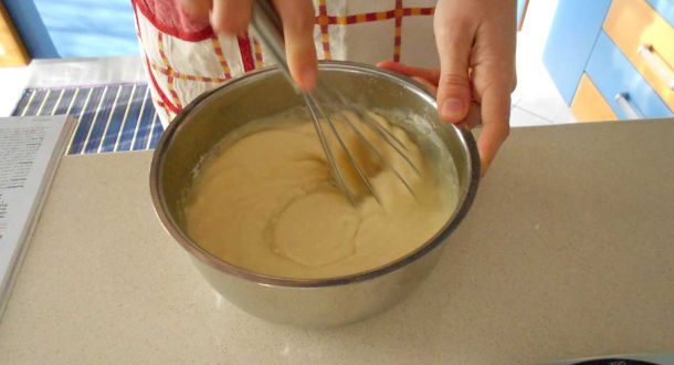 Sciogliere il burro nel latte caldo. Sbattere l'uovo con l'albume insieme allo zucchero. Aggiungere il latte, la farina e la grappa. Far riposare 30 minuti coperto con un canovaccio.