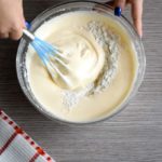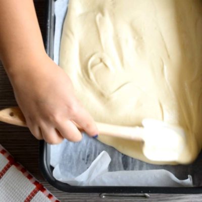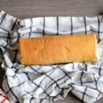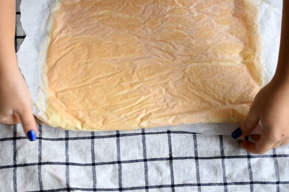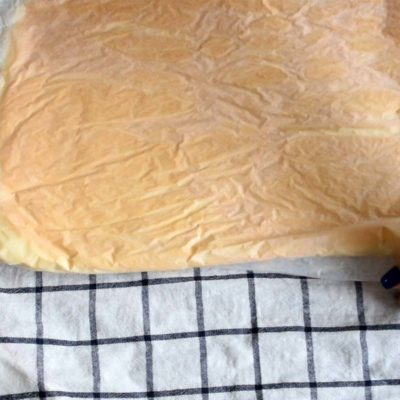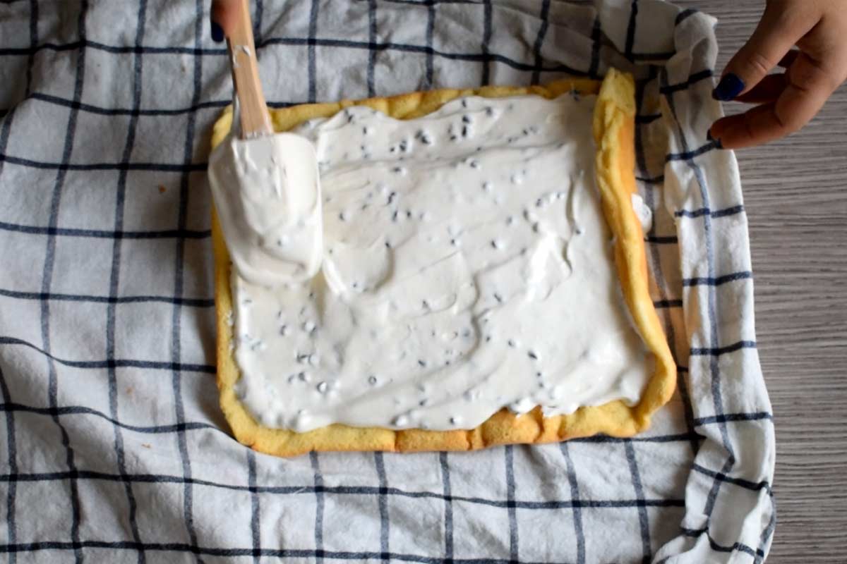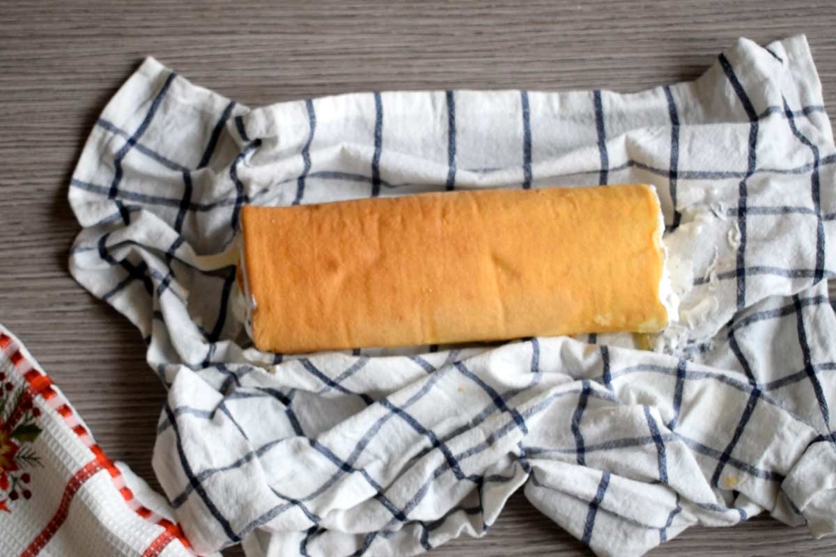 Foderare con carta forno una teglia rettangolare di 31 x 22 cm e cuocere a 180° in forno preriscaldato per 13 minuti. Una volta trascorso il tempo di cottura, preparare su di una spianatoia un canovaccio bagnato, ribaltarvi sopra la pasta biscotto e arrotolare. Lasciar raffreddare. Questa operazione servirà per far rimanere la pasta biscotto umida e facile da arrotolare in modo che non si rompa. (5,6,7) |