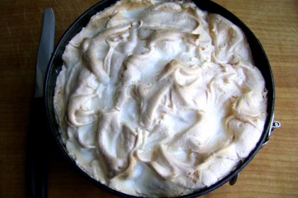 Mescolare i tuorli con il latte ed il succo di limone.(4) Versare la crema sulla base di biscotti e cuocere ancora in forno per 15 minuti. (5) Preparare infine la meringa montando gli albumi a neve con il sale ed unendo man mano lo zucchero. Si dovrà ottenere un composto molto denso. Spalmarlo sulla crema e trasferire in forno per l’ultima volta. Abbassare la temperatura e cuocere fin quando la superficie si scurisce leggermente. (6)