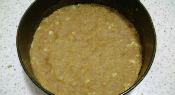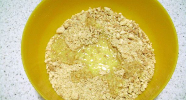 Ridurre i biscotti in farina e mescolarli con il burro fuso. (1) Versare il composto ottenuto sul fondo di una tortiera rivestita di carta forno, pressare e livellare bene, quindi trasferire in forno caldo, cuocere per circa 10 minuti a 180 °C. (2) Adesso preparare la crema (3).