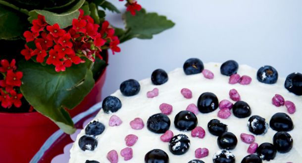 Coprire con l’altro disco, spalmare ancora di panna e decorare a piacere con altri mirtilli.
